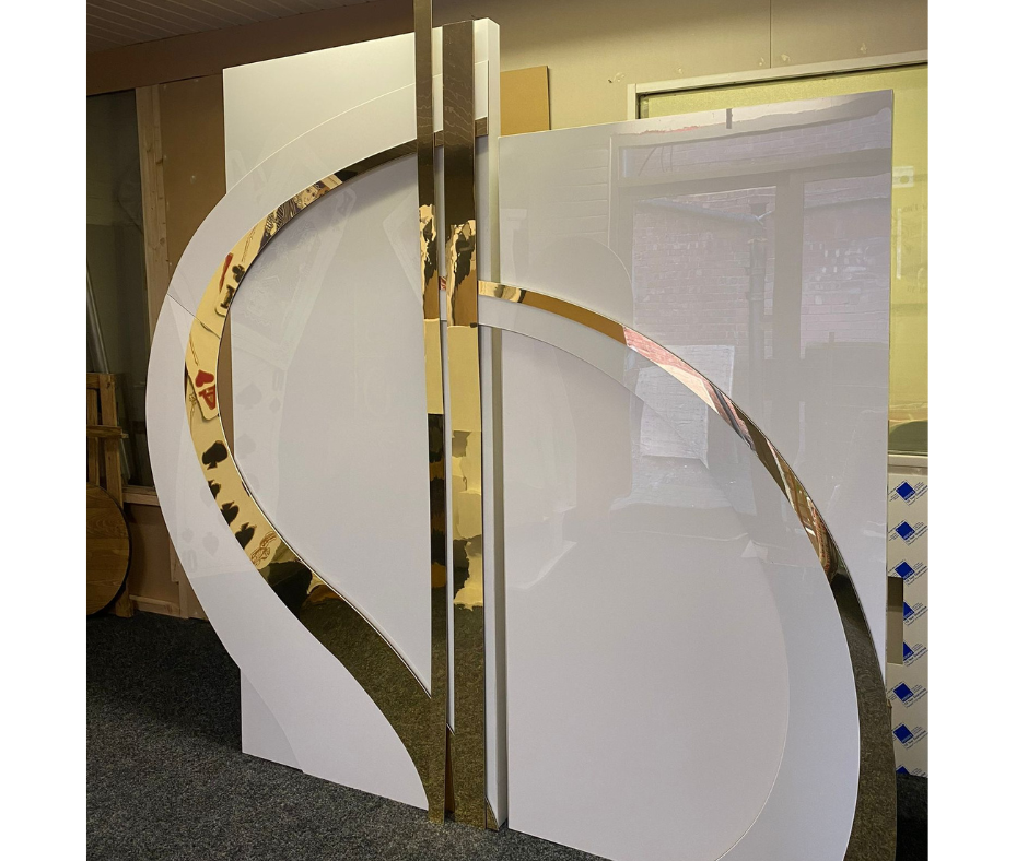 Our stunning high gloss backdrop is made to order, the two rectangular panels are covered in high gloss on the front & sides with folding stand on the back, the curved effect is mirrored gold and attached with Velcro for easy removal and attachment.